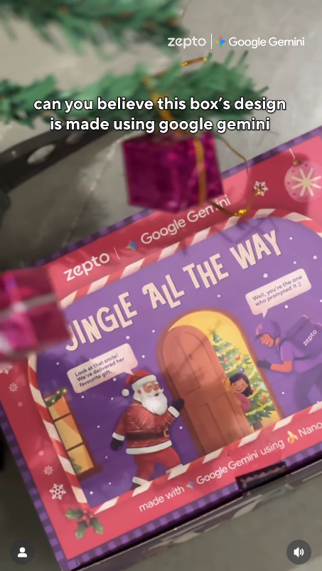 Zepto collaborated with Google India on Christmas 2025 to develop box designs using Google Gemini. They engaged audiences with gift campaigns by scanning and ordering stuff on Zepto.